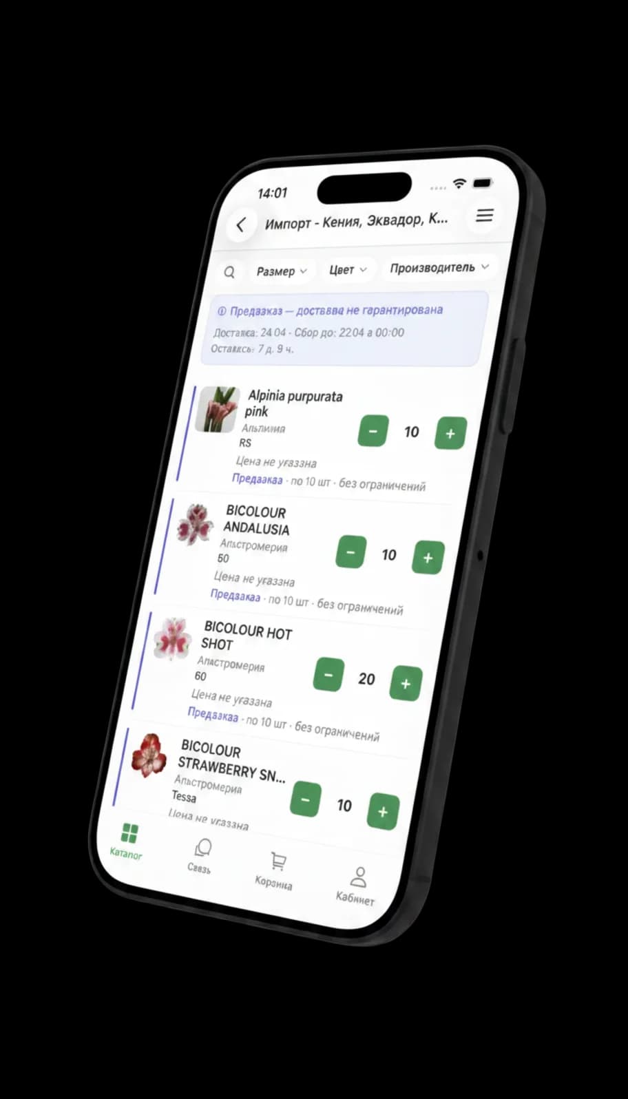 Вы формируете коллекцию из каталога — в системе уже более 10 000 товаров, либо добавляете свои. Указываете лимиты по позициям, дату закрытия сбора и дату прибытия. Клиенты собирают заказы в приложении до закрытия — на выходе вы получаете итоговый сводный заказ.
